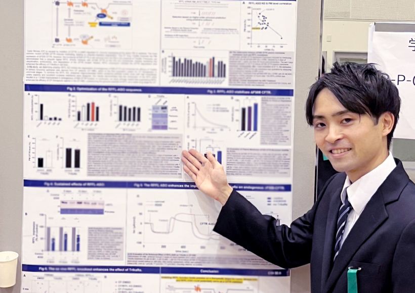 2023年12月に神戸で開催された第97回日本薬理学会年会では、自らの研究成果として開発した核酸医薬アンチセンスオリゴについて発表。嚢胞性線維症で壊れたCFTRの機能改善効果を紹介し、「優秀座長賞(ポスター)」を受賞しました。「今は順調に研究を進められている。それをどんどん形にしていくことが、当面の目標です」。